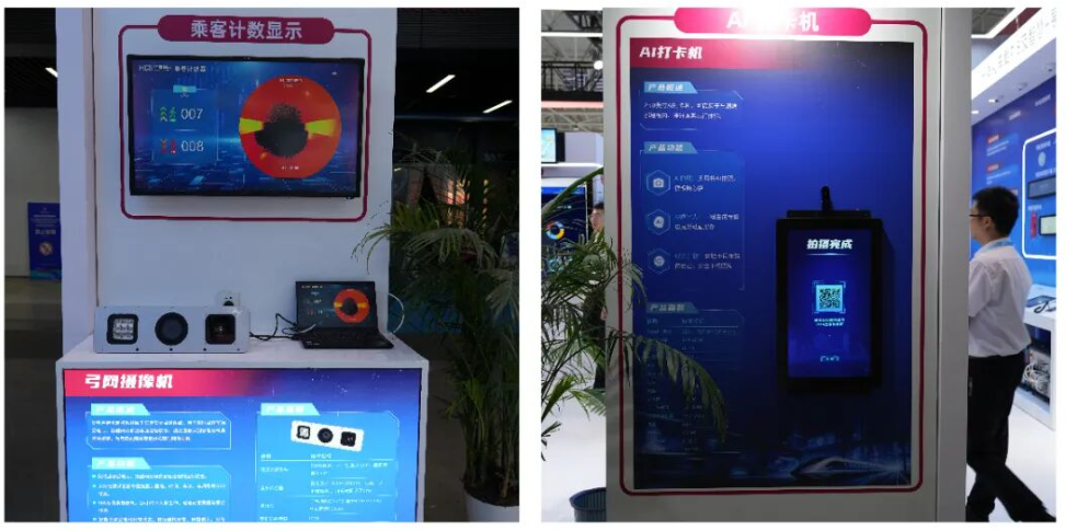 现场展示的乘客计数器可实时精准统计客流,安全员摄像机搭配 AI 识别算法能快速预警异常行为,23.8 英寸嵌入式 AI 打卡机则增强了乘客互动体验。